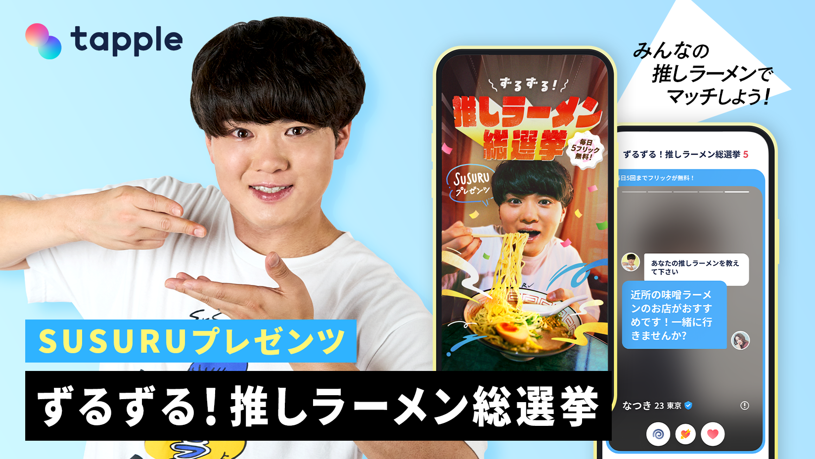 株式会社タップル(本社:東京都渋谷区、代表取締役社長:平松繁和)は運営するマッチングアプリ「タップル」において、「毎日ラーメン健康生活」をテーマに活動している人気YouTuber「SUSURU」とのコラボレーションコンテンツ「ずるずる!推しラーメン総選挙」を、2025年10月31日(金)〜12月26日(金)の期間限定で提供することをお知らせいたします。また、本コンテンツを公開するにあたり、ラーメンに関するアンケート調査を「タップル」内で実施いたしました。