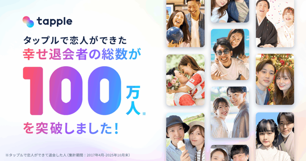 株式会社タップル(本社:東京都渋谷区、代表取締役社長:平松繁和)は運営するマッチングアプリ「タップル」において、「幸せ退会者」数が累計100万人を突破したこと※を記念し、2025年12月22日(月)より「年末年始キャンペーン」を実施することをお知らせいたします。
