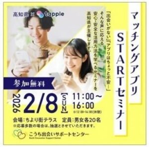 マッチングアプリ「タップル」を運営する株式会社タップル(本社:東京都渋谷区、代表取締役社長:平松繁和)は、2025年12月に高知県と締結した「出会い・恋愛・結婚応援に関する連携協定」の取り組みの一環として、2026年2月8日(日)に高知県主催の「マッチングアプリSTARTセミナー」へ協力いたしました。